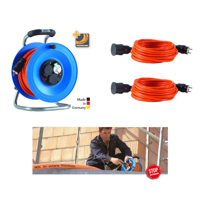 Bedruckungs-Paket 2.00, 1 x Kabeltrommel Professional Kunststoff im Blau, 50 m 2 x Panzerkabel-Verlängerungsleitungen PLUS, 25 m Orange H07BQ-F 3G1,5
