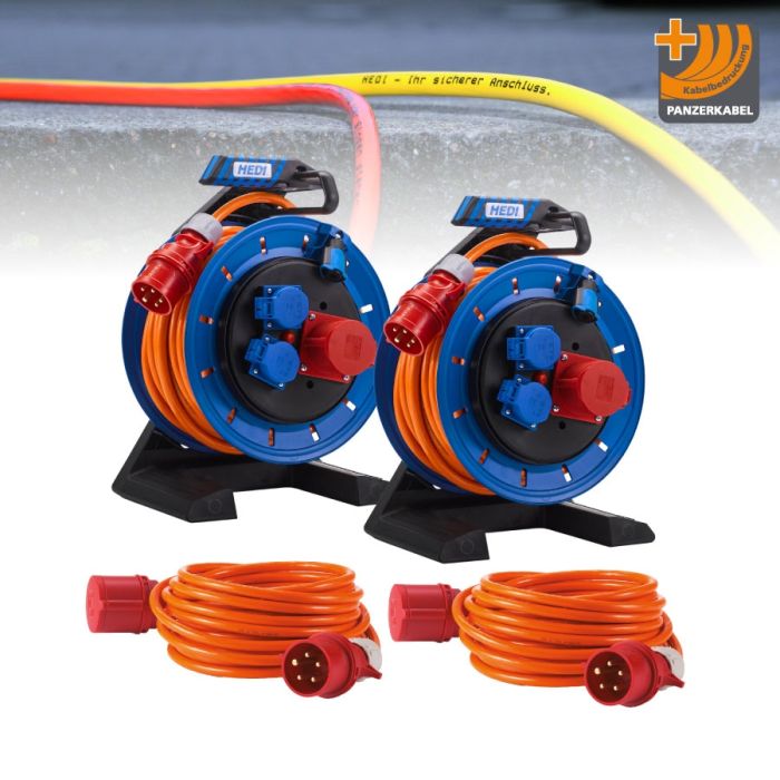 2x HEDI Vollkunststoff-Drehstromkabeltrommel Generation 7 Champion Kabeltrommel-Ø 290 mm mit 25 m HEDI Panzerkabel PLUS H07BQ-F 5G2,5 in orange