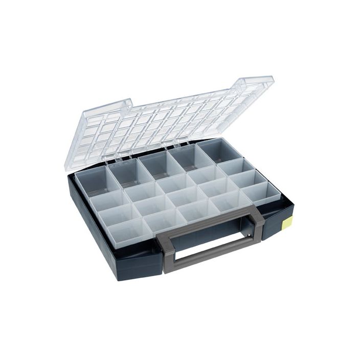 Sortimentskoffer mit losen Einsätzen: 15 Stück Typ BA8-1, 5 Stück Typ BA7-1. Inkl. Tragegriff mit Einhand-Verriegelung. Mit O-Profilen im Deckel, die ein Verrutschen des Inhalts beim Transport verhindern.
