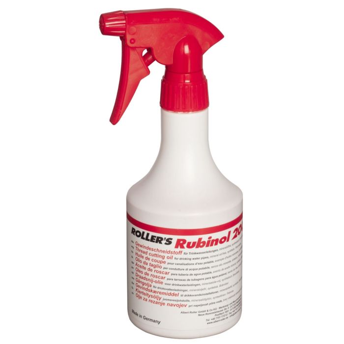 ROLLER’S Rubinol 2000 500 ml Spritzflasche. Synthetischer, mineralölfreier, ethanolfreier Gewindeschneidstoff speziell für Trinkwasserleitungen. Für alle Materialien. Sehr hohe Schmier- und Kühlwirkung für saubere Gewinde und hohe Standzeit der Schneidbacken. Vollständig wasserlöslich, zur Auswaschkontrolle rot eingefärbt, entsprechend den Vorschriften. DVGW-Prüf.-Nr. DW-0201AS2031, ÖVGW-Prüf.-Nr. W 1.303, SVGW-Prüf.-Nr. 9009-2496. Viskosität bei –10°C: ≤ 250 mPa s (cP). Pumpfähig bis –28°C. Auch universell zum Gewindeschneiden hervorragend geeignet. Auch als Kühlschmierstoff zum Sägen von Metallen. Umweltfreundlich da nachfüllbar. Deutsches Qualitätsprodukt.